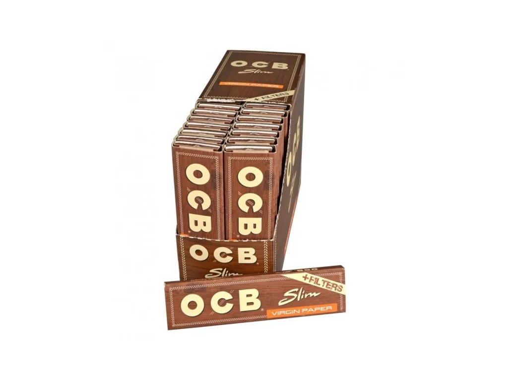 Nebělené papírky OCB Virgin Slim v balení s filtry. Přírodní hnědý papír v extra tenkém provedení zajišťuje čistou chuť tabáku a pomalé hoření.