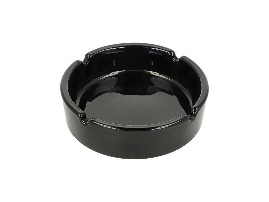 Klasický skleněný popelník Basic v elegantní černé barvě. Průměr 10,9 cm, čtyři odkládací místa na cigarety a snadná údržba díky lesklému povrchu.