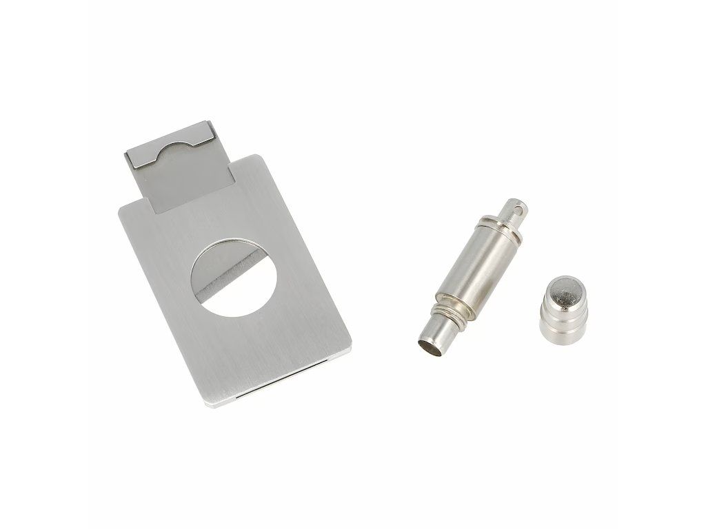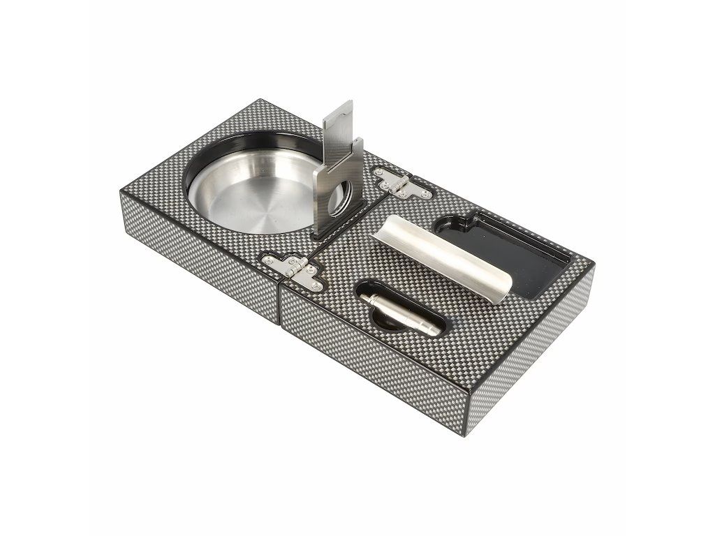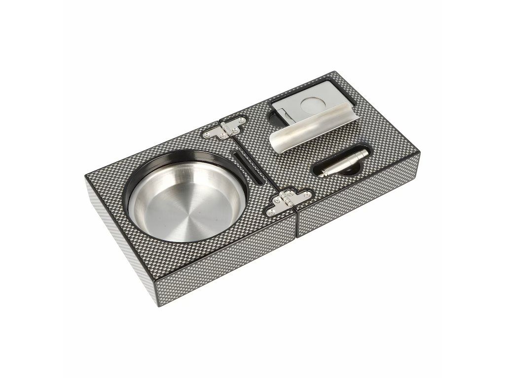 Elegantní rozkládací popelník na doutníky v imitaci carbonu má povrch ve vysokém lesku. Popelník je vybavený kovovým odkladem pro jeden doutník a prostorem pro popel s vyjímatelnou nerezovou vložkou, která se díky hladkému povrchu snadno čistí. Dále v doutníkové sadě najdeme gilotinový doutníkový ořezávač a vyštípávač z broušeného nerezu. Ořezávač na doutníky je možné použít při ořezávání nejen v ruce na plocho, ale především jako klasickou gilotinu. Do drážky uprostřed popelníku vložíme ořezávač na stojato a doutník položíme na kovový odklad, který současně slouží jako podpěra. Vsuneme konec doutníku do otvoru ořezávače a ořízneme. Pokud není popelník používán, lze ho pro úsporu místa zavřít. Během této doby je ořezávač a vyštípávač doutníků uložený v prostoru pro ně určeném. K zamezení vypadnutí kovové vložky a ořezávače při zaklopení popelníku slouží zabudovaný magnet, které je pevně přichytí.