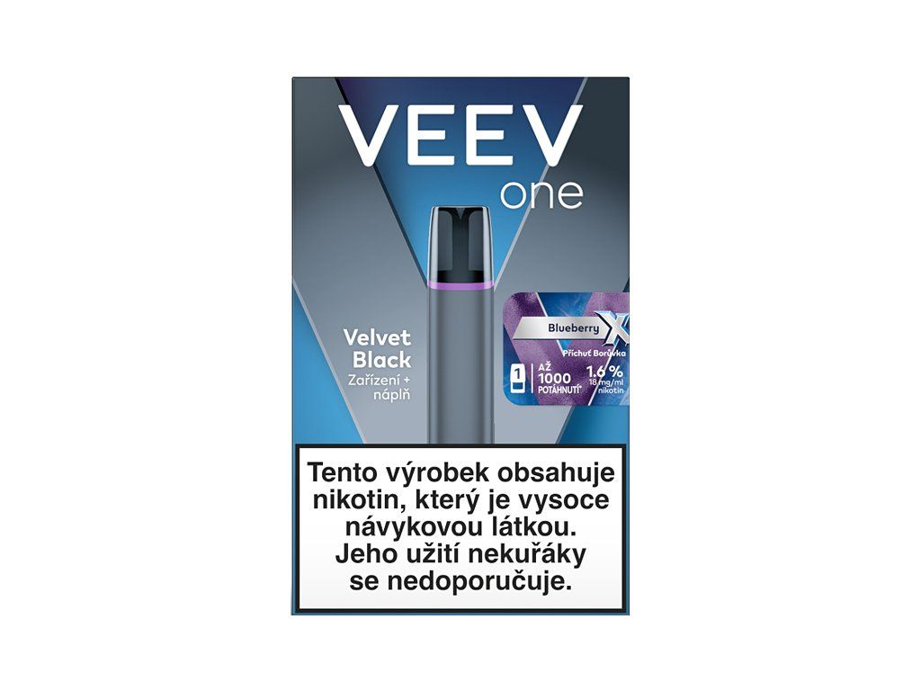 Startovací sada VEEV One Starter Kit v barvě Velvet Black. Obsahuje prémiové zařízení a náplň Blueberry X (18 mg/ml) s extra intenzivní chutí borůvek.