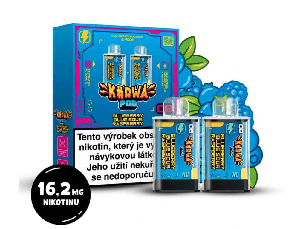 Náhradní pody Kurwa s příchutí borůvky, kyselé maliny a 20mg nikotinu. Balení obsahuje 2 kusy, každý s výdrží až 700 potahů. Kvalitní náplně značky Kurwa.