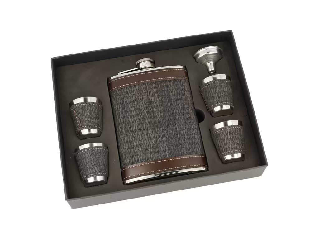 Dárková sada nerezová placatka na alkohol s pohárky a nálevkou. Likérka vyrobená z kvalitní nerezové oceli má leštěný povrch. Placatka a pohárky jsou potažené koženkou s jemnou texturou ve hnědo šedé kombinaci. Likérka klasického tvaru je vybavená šroubovacím uzávěrem a držákem víčka, který zabrání jeho ztrátě. Koženkový potah s látkou dodává placatce nevšední vzhled a je příjemný na dotek. Pohárky a nálevka jsou vyrobené z kvalitního nerezu. Mějte i na cestách při sobě Váš oblíbený nápoj. Skvělý dárek, kterým určitě potěšíte své blízké či kamarády. Placatka s pohárky je dodávaná v dárkové krabičce.