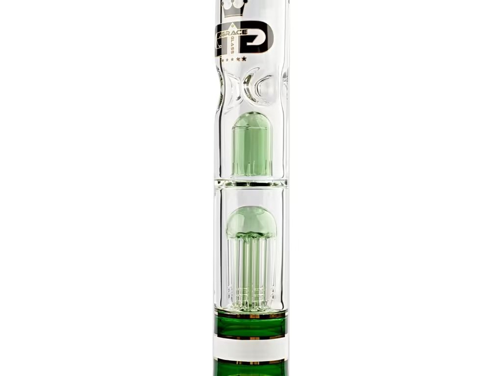 Prémiový skleněný bong Grace Glass z edice Golden Line Green o výšce 46 cm. Nabízí pokročilou perkolaci pro filtraci dýmu, ledovač a masivní 7mm borosilikátové sklo.
