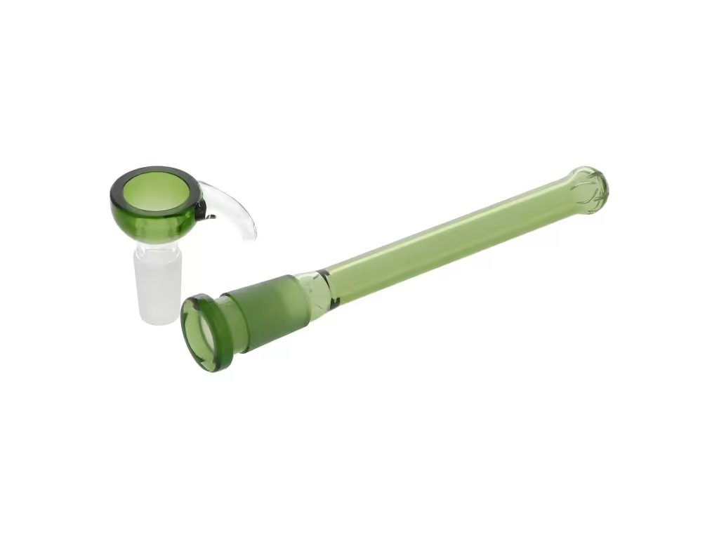 Skleněný bong Grace Glass z exkluzivní edice Golden Line Green je uměleckým dílem i vysoce funkčním nástrojem pro náročné uživatele. Rovný bong tvaru laboratorní kádinky ve tmavším zeleném tónu s logem Grace Glass, zdobený zlatými proužky je ukončený silným hrdlem. Ice bong je vybavený "výstupky" pro udržení kostek ledu k ochlazení kouře. Perkolace typu Arm s osmi rameny kouř dokonale rozděluje, zjemňuje a pomáhá ochlazovat. Praktický splashguard ve tvaru kopule, který je umístěný nad perkolací, zabraňuje nasátí vody do úst. Ve spodní části najdeme zaslepený otvor pro turbo. Oproti standardním bongům je tento prémiový bong vyrobený z tepelně odolného borosilikátového skla tloušťky 5 mm. Dvoudílný chillum se slit difuzérem je ukončený samostatným kotlíkem s držátkem a otvorem cca 7 mm.