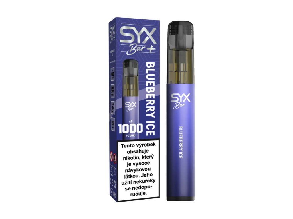 Jednorázová e-cigareta SYX BAR s příchutí borůvky s ledem a 16,5 mg nikotinu. Značka SYX nabízí až 1000 potáhnutí, stylový design a osvěžující ovocnou chuť.