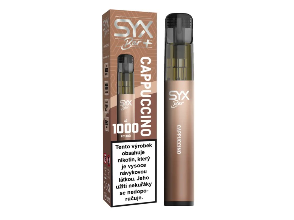 Jednorázová e-cigareta SYX BAR s příchutí cappuccina a 16,5 mg nikotinu. Značka SYX nabízí až 1000 potáhnutí, stylový design a vyváženou kávovou chuť.