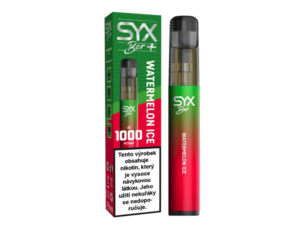 Jednorázová e-cigareta SYX BAR s příchutí vodního melounu, ledu a 16,5 mg nikotinu. Značka SYX nabízí až 1000 potáhnutí, stylový design a osvěžující chuť.