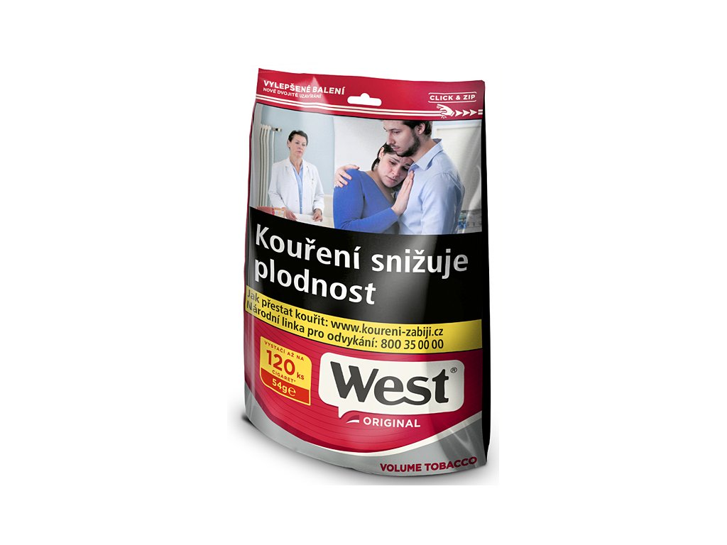 Kvalitní cigaretový tabák West Red v 54g balení. Silnější směs s plnou chutí, ideální pro ruční balení i plnění dutinek. Prověřená kvalita od značky West.