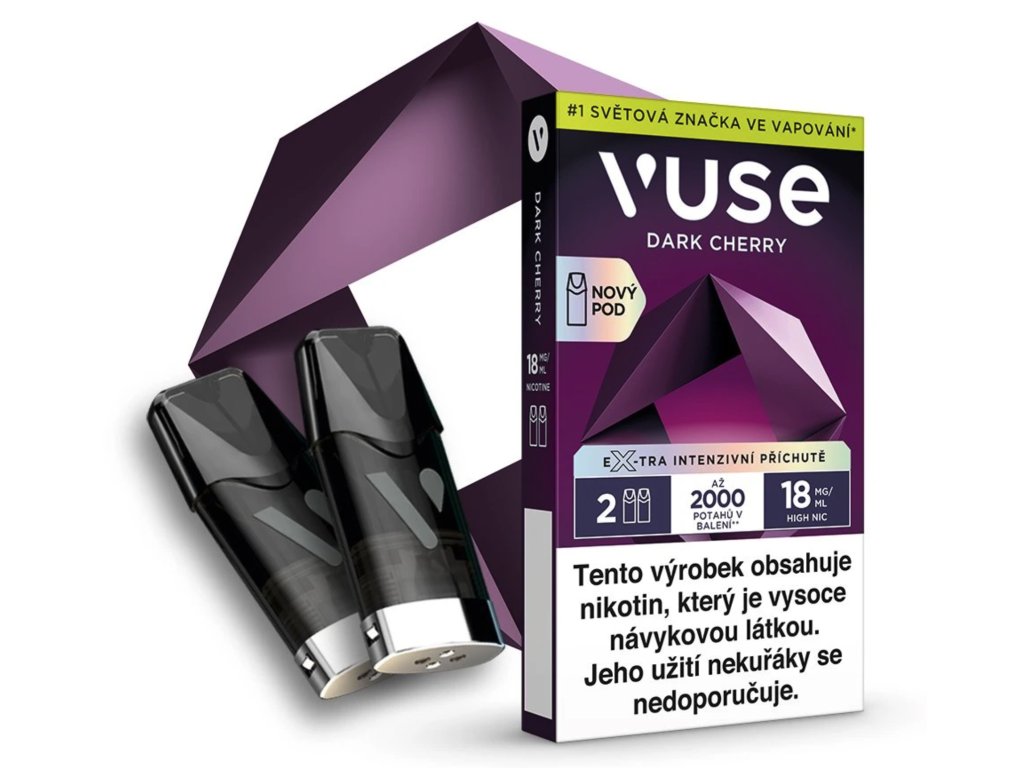 Náhradní náplň Vuse Pod s příchutí Dark Cherry a 18 mg nikotinu. Značka Vuse přináší hlubokou a intenzivní chuť tmavých třešní pro dokonalý požitek.