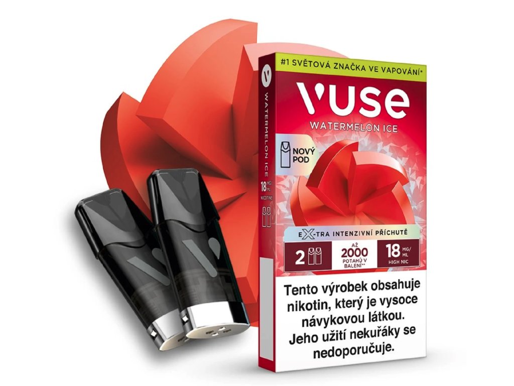 Náhradní náplň Vuse Pod s příchutí Watermelon Ice a 18 mg nikotinu. Značka Vuse přináší osvěžující a sladkou chuť vodního melounu s ledovým dozvukem.