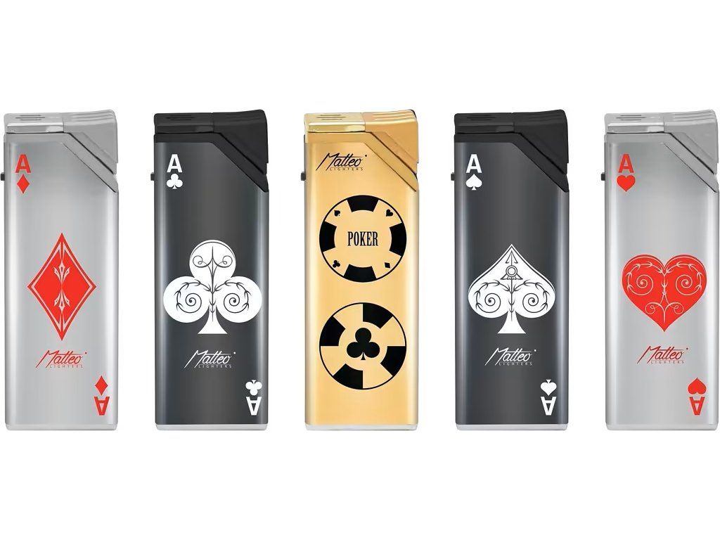 Tryskový zapalovač Matteo. Plnitelný kovový turbo zapalovač s možností nastavení výšky plamene. Prodej pouze po celém balení (displej) 25 ks. Výška zapalovače 7,4 cm.