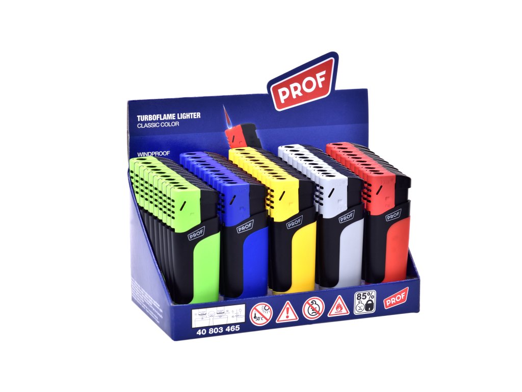 Barevný zapalovač PROF Turbo s výkonným větruodolným plamenem. Spolehlivý pomocník v každém počasí. Ergonomický design, plnitelný plynem a dostupný v mnoha barvách.